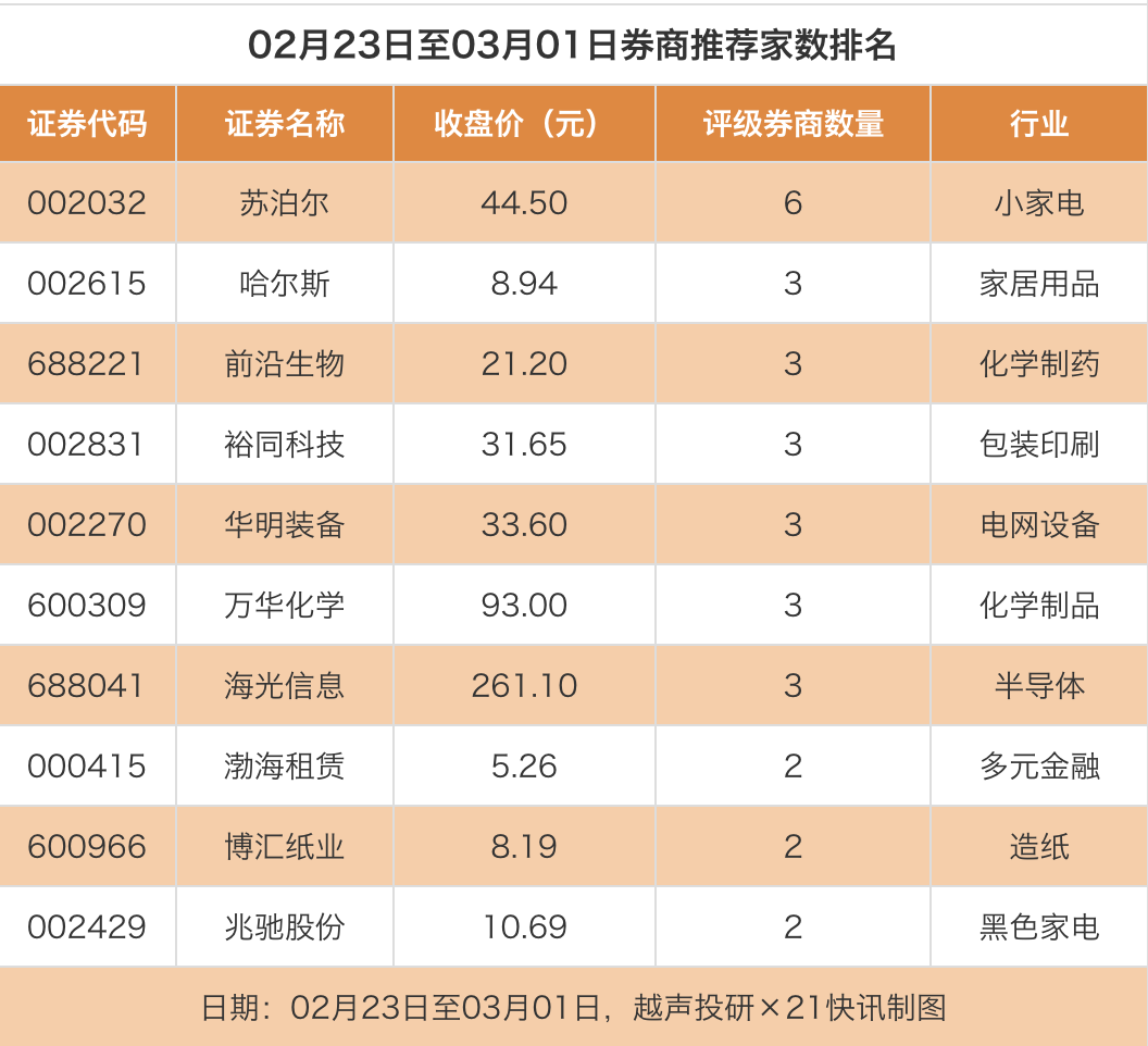 从券商推荐家数来看,2月23日至3月1日有181家上市公司得到券商推荐,其中苏泊尔获得6家推荐,哈尔斯、前沿生物等获得3家推荐。