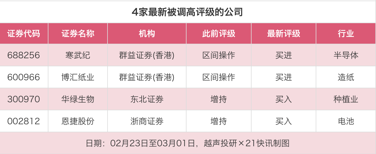 评级调高方面,2月23日至3月1日,券商调高上市公司评级达到4家次,最新数据包括了群益证券(香港)对寒武纪、博汇纸业的评级从“区间操作”调高至“买进”,东北证券对华绿生物的评级从“增持”调高至“买入”。