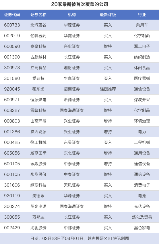 首次覆盖方面,2月23日至3月1日券商共给出了65次首次覆盖,其中北汽蓝谷获得华源证券给予“买入”评级,亿帆医药获得华鑫证券给予“买入”评级,泰豪科技获得兴业证券给予“增持”评级,古麒绒材获得长江证券给予“买入”评级,立高食品获得湘财证券给予“买入”评级。