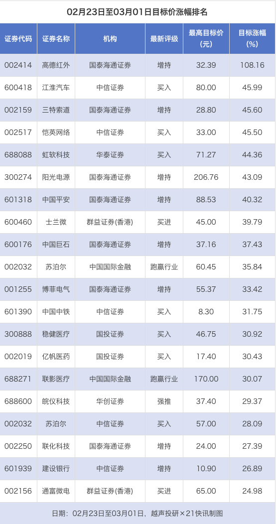 越声投研数据显示,2月23日至3月1日,券商给予上市公司目标价共53次,按最新收盘价计算,目标价涨幅排名居前的公司有高德红外、江淮汽车、三特索道,目标价涨幅分别为108.16%、45.99%、45.60%,分别属于军工电子、商用车、旅游及景区行业。