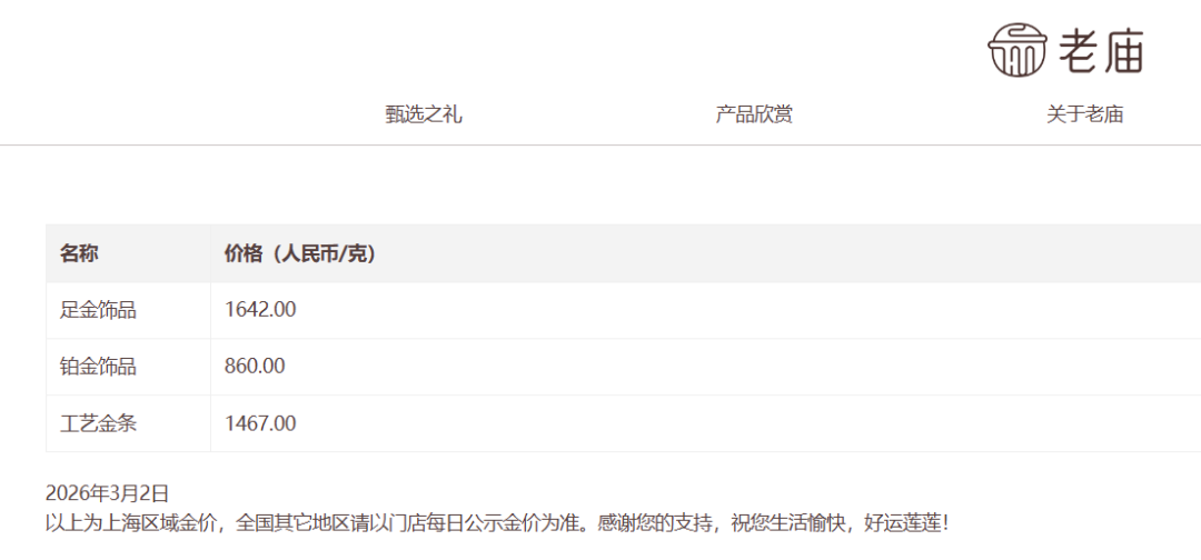 同时,国内品牌金饰克价也随之上扬。中新经纬2日查询发现,老庙黄金金饰1642元/克,单日上涨34元;老凤祥为1620元/克,单日涨45元;周生生金饰1622元/克,单日上涨20元。
