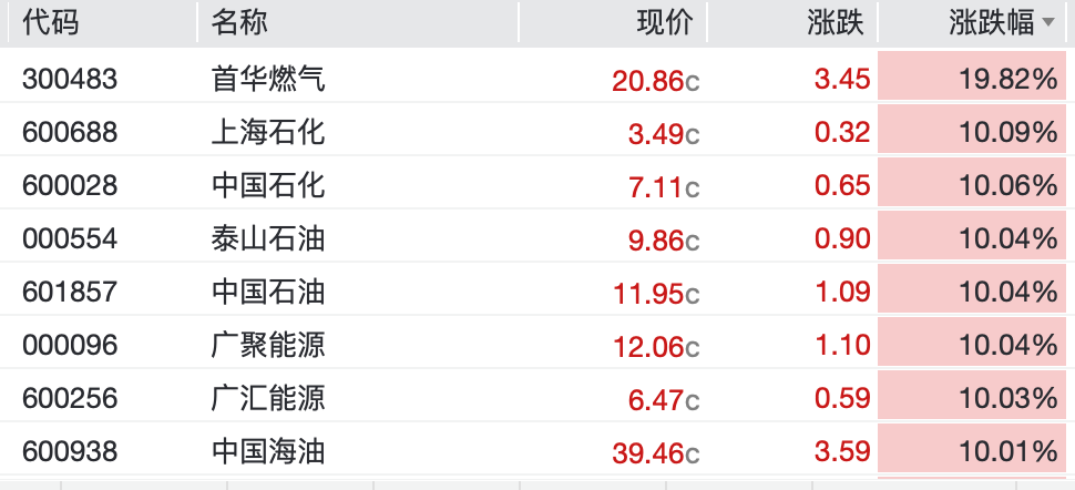 油气股全线爆发,近20股涨停,“三桶油”历史首次收盘集体涨停,中国石化尾盘集合竞价触及涨停,成交超74亿,此前中国海油、中国石油双双涨停,“三桶油”历史首次股价集体报收涨停。此前在2024年10月8日,“三桶油”盘中均一度触及涨停。