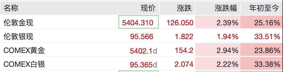 贵金属概念集体走强,晓程科技20cm涨停,西部黄金、四川黄金等多股涨停。截至15:00,现货黄金急速拉升,站上5400美元关口,目前涨幅接近2.4%,现货白银涨近2%,报95.566美元/盎司。