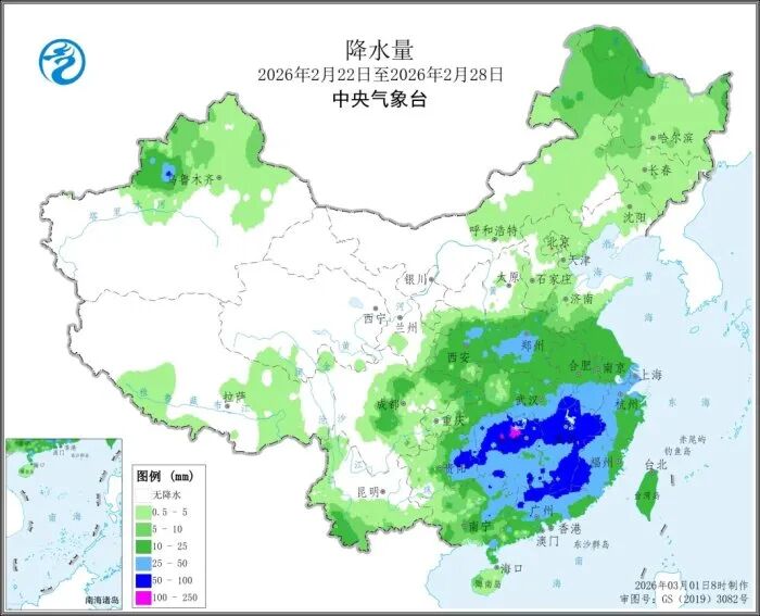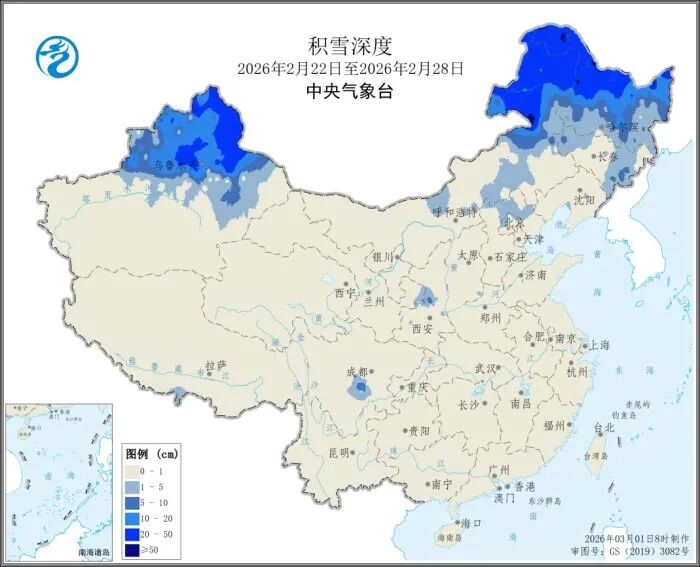 中东部大部地区出现雨雪天气,新疆北部、内蒙古东北部、黑龙江大部、吉林东部及西北部等地最大积雪深度为1至20厘米,局地20至50厘米;华北南部、西北地区东部、黄淮中西部、江淮、江汉、江南、华南、四川盆地及云南南部和贵州中东部等地降水量为5至50毫米,湖南北部、江西北部和东部、贵州东部、广东北部、福建西部等地降水量达50至100毫米,上述大部地区降水量较常年同期偏多5成至2倍,全国其余农区降水量在5毫米以下或无降水。
