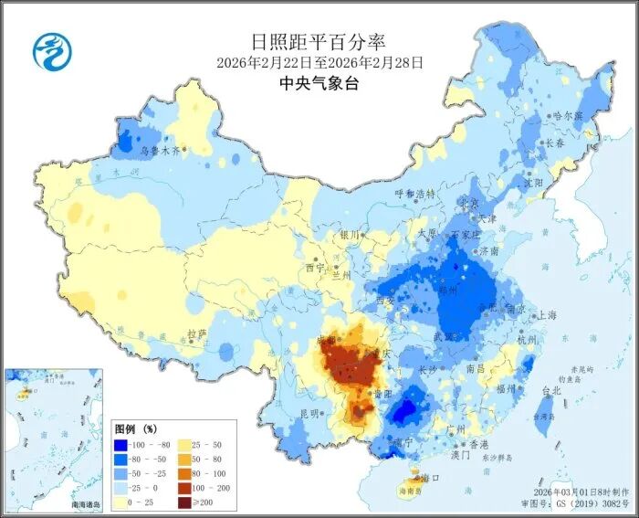 全国大部农区日照时数接近常年或偏少3至5成,其中华北南部、黄淮中部、江淮西部、江汉东北部、广西北部等地偏少5至8成;西南地区东部偏多3成至2倍,部分地区偏多2倍以上。
