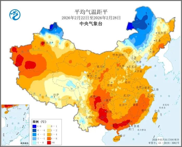 上周(2026年2月22日至28日),全国大部农区气温较常年同期偏高1至4℃,其中江南东部及中部、西南地区东部、华南大部等地气温偏高4至6℃,四川东南部、贵州西部、广西西北部及东南部、广东中部等地部分地区偏高6℃以上;新疆北部、内蒙古东部等地偏低1至6℃。