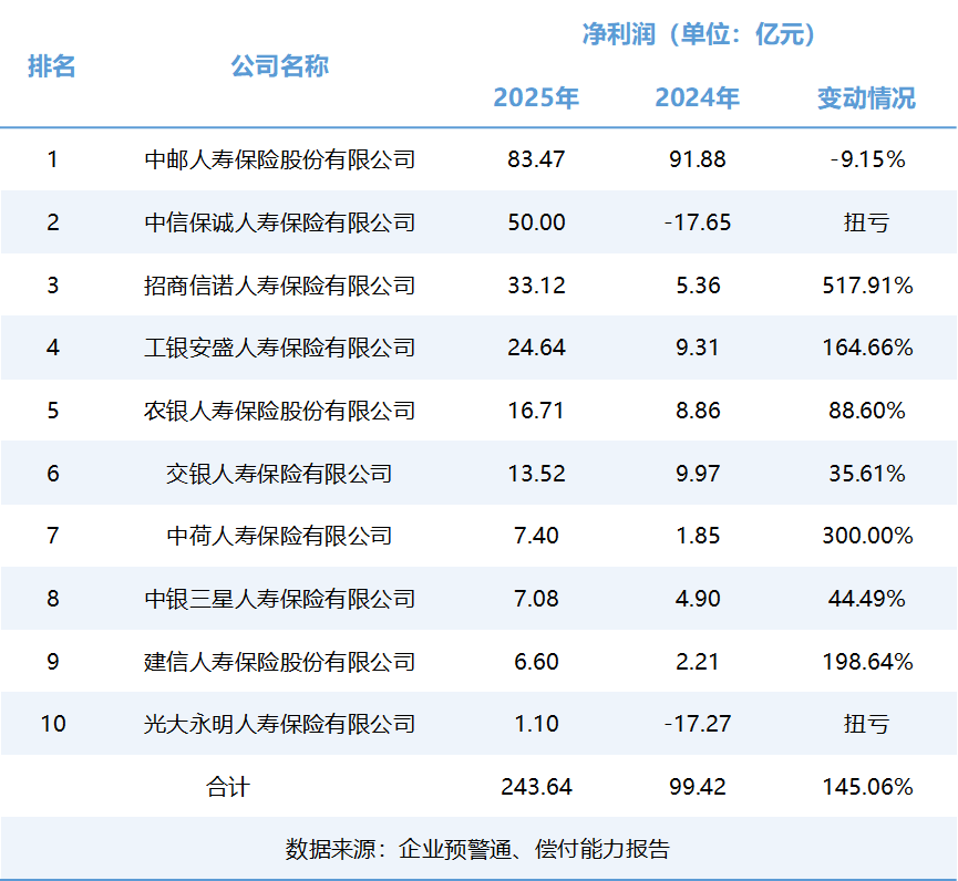 与保费收入的稳健增长相比,银行系寿险公司2025年的净利润表现更为夺目,呈现整体性、大幅度改善。