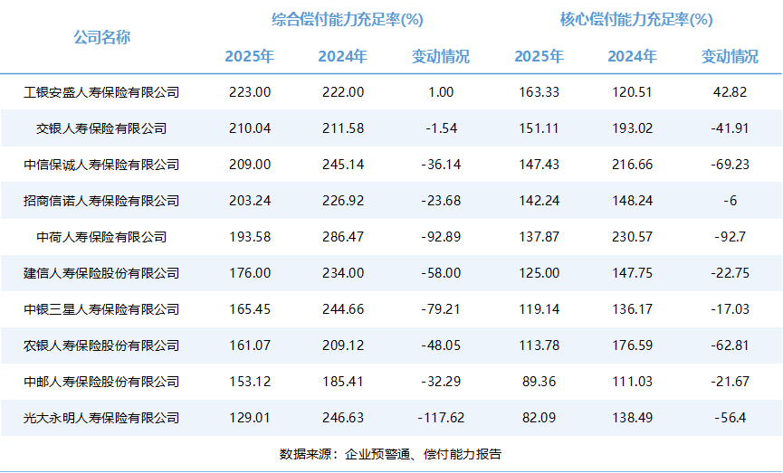 从综合偿付能力充足率看,10家公司2025年末的数据全部高于100%,高于监管红线,安全性无虞。但除工银安盛人寿微升1个百分点至223%外,其余九家公司均出现下降。其中,光大永明人寿从246.63%大幅下降117.62个百分点至129.01%,中荷人寿从286.47%下降92.89个百分点至193.58%,中银三星人寿、建信人寿、农银人寿的降幅也均在50个百分点左右。