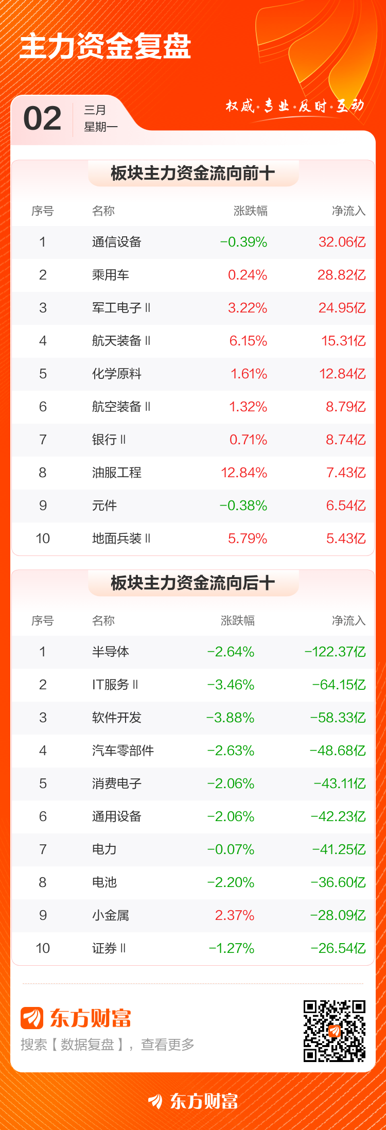 3月2日,沪指涨0.47%,深成指跌0.2%,创业板指跌0.49%。两市成交额3.02万亿,较上个交易日放量5327亿。数据显示,今日大盘主力资金净流出954.98亿。通信设备、乘用车、军工电子Ⅱ等板块主力资金流入排名居前,其中通信设备净流入32.06亿元。