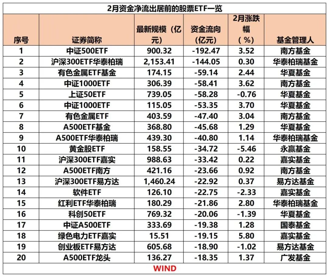 2 月宽基 ETF 资金净流出居前