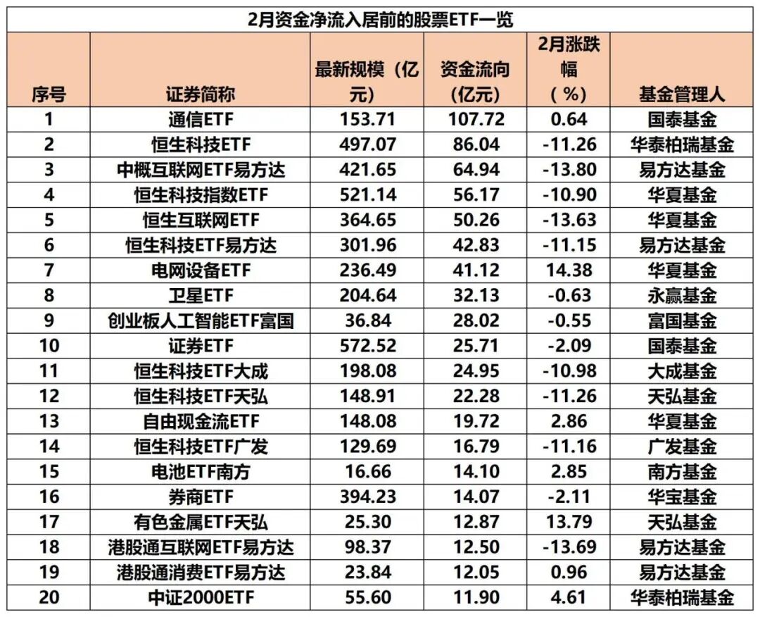 具体来看, Wind 数据显示, 2 月,国泰通信 ETF 资金净流入达 107.72 亿元,位列第一;恒生科技 ETF 、中概互联网 ETF 、恒生科技指数 ETF 、恒生互联网 ETF 等成为 “ 吸金 ” 主力。