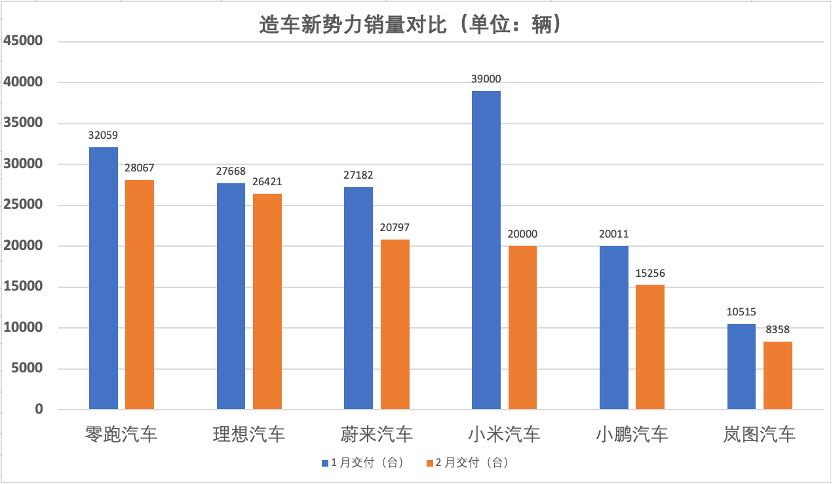 小米汽车交付量同样处于调整阶段。官方依旧未披露具体数值,称其2月交付量超20000辆,以此估算,其同比下滑约15.7%。