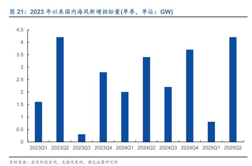 实际上,从2024年以来,我国海风招标加速进行。据国元证券统计,2024年国内海风招标 11.3GW,各地海风项目密集启动,热点项目青州、阳江帆石、江门川岛、汕尾红海湾等均有较大进展,2025 年上半年国内海风招标 5GW,全年约10GW,持续维持较高水平。