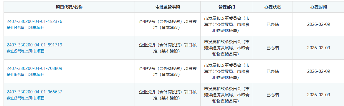 消息面上,近日,国内海风项目迎密集核准。2月9日,浙江省宁波市发展和改革委员会发布关于象山3-6#项目核准变更的复函,对项目容量进行调整,4个项目拟开工时间2026年10月,这批延期项目有望重启。
