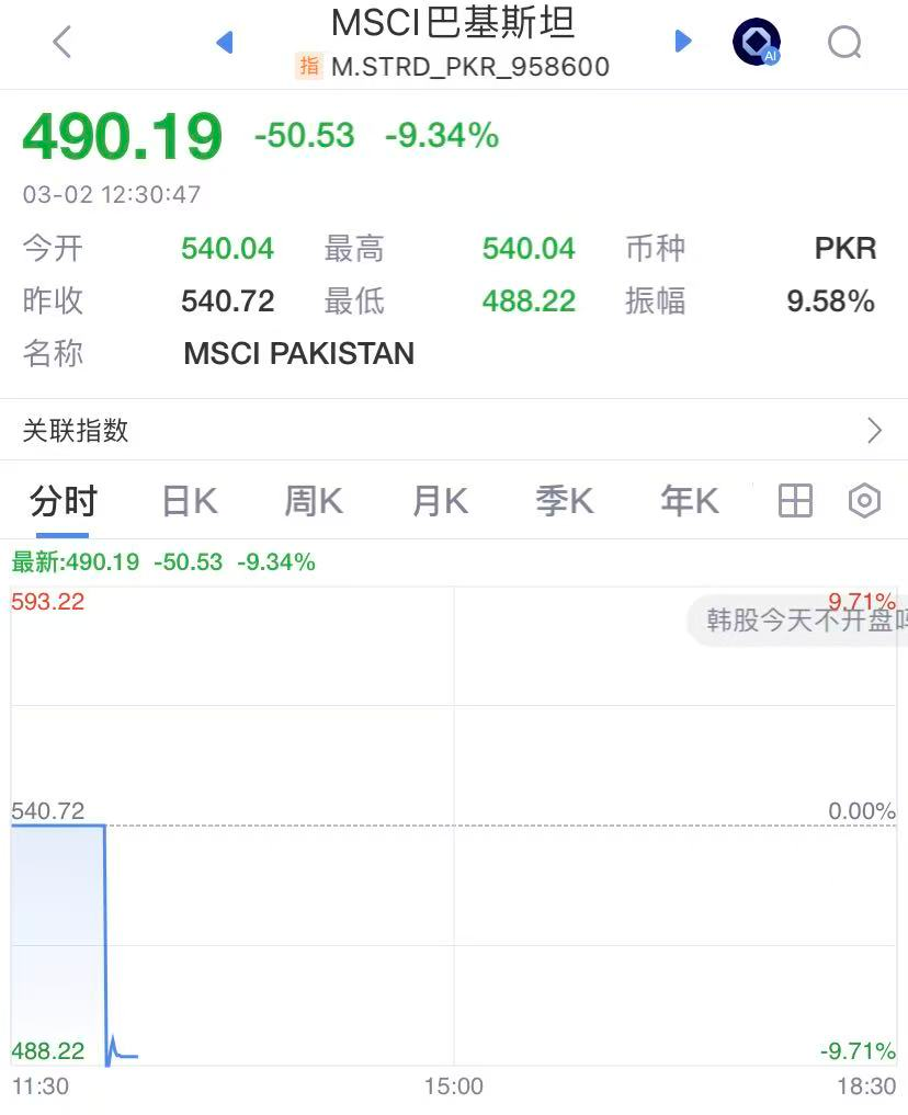 3月2日午后,巴基斯坦股市下跌9.6%,触发暂停交易,截至北京时间12:30左右,跌幅为9.34%。