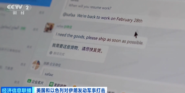 义乌国际商贸城经营户 王玉霄:在我们没有开工之前,阿联酋、伊拉克、伊朗的客户就发消息,询问他们货的准备状况。因为受到局势影响,中东客户希望货能尽早发出去。