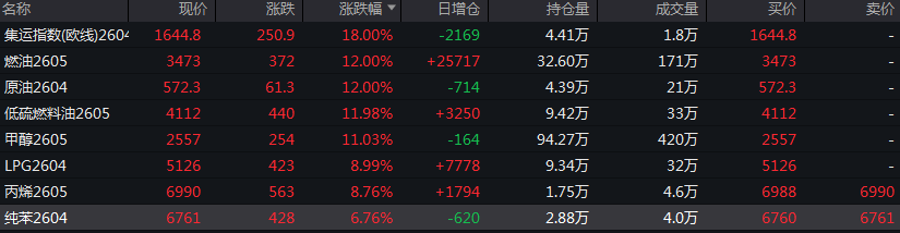 3月2日,国内期货市场出现涨停的12个品种,其中除了上述集运指数期货外,其余多数来自原油及其石化产业链,比如丙烯、塑料、乙二醇、纯苯等化工品。