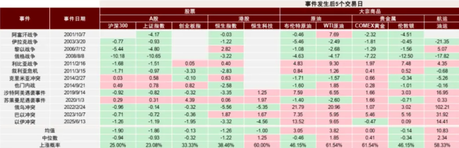 继续以航运市场为例,中金公司统计的历史上地缘军事行动后大类资产表现结果显示,在事件发生后的5个交易日里,油运价格大概率上涨,2023年巴以冲突后上涨31.92%,2025年以伊冲突后上涨14.41%。