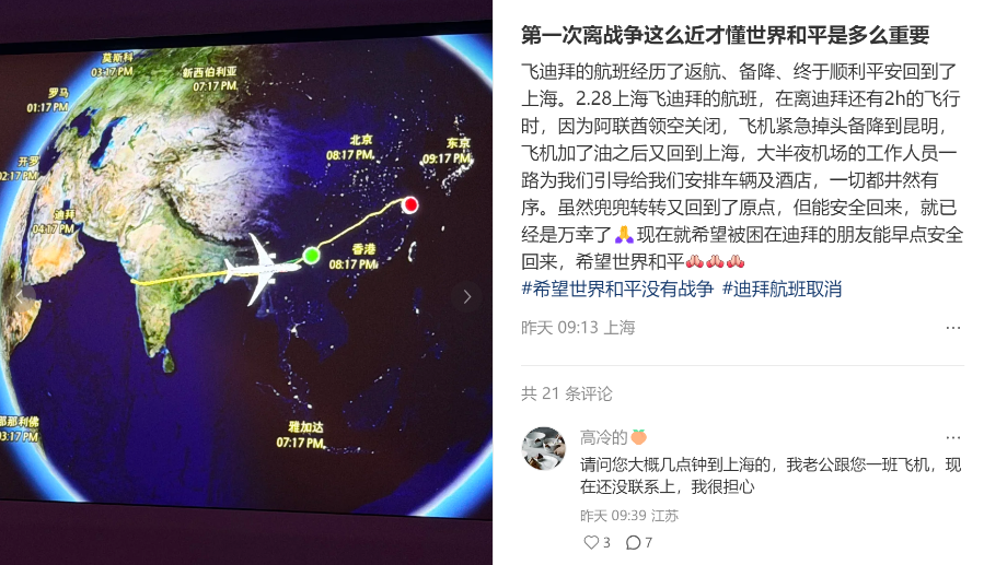 同样在这天,有人幸运地踏上最后的航班从中东回到上海,落地时发现“逃过一劫”。“现在想想还瑟瑟发抖,赶上了倒数第二班回上海的飞机。”有人这样写下心情。