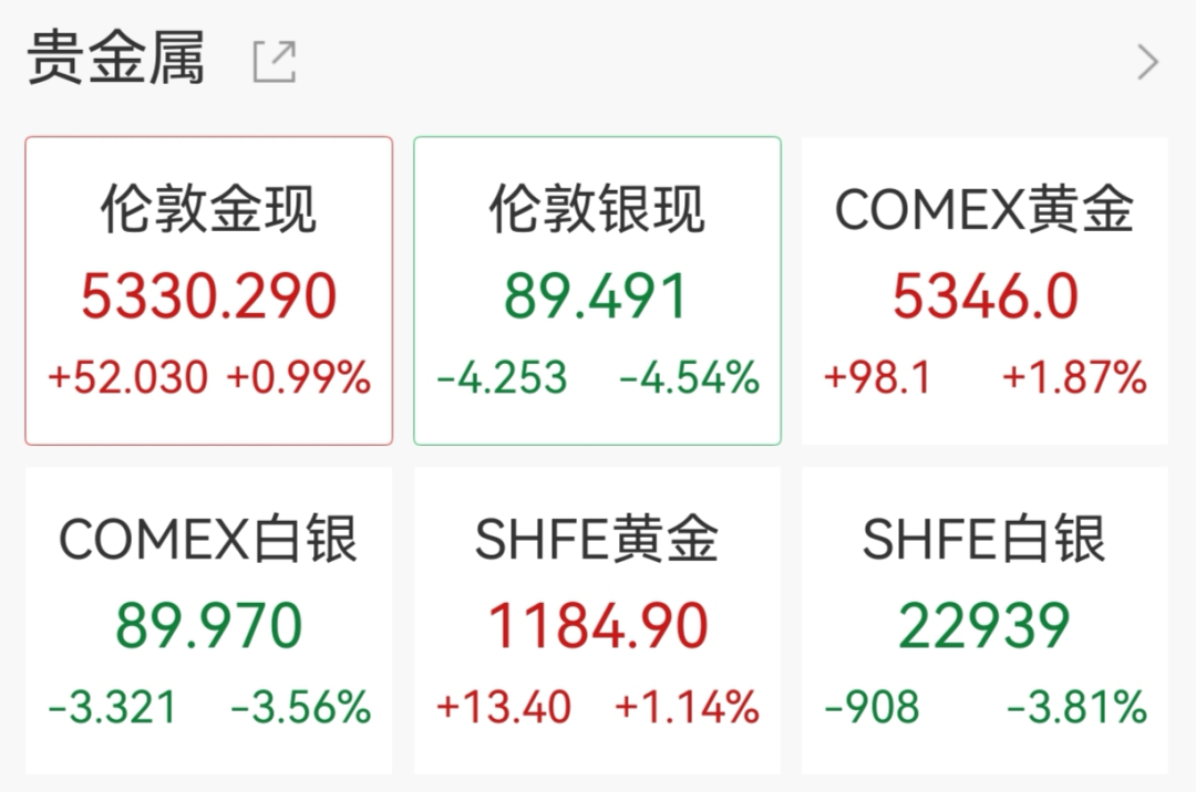 贵金属方面,3月2日纽约尾盘,现货黄金涨0.99%,报5330.29美元/盎司,COMEX黄金期货涨1.87%,报5346美元/盎司。现货白银跌4.54%,报89.491美元/盎司,COMEX白银期货跌3.56%,报89.97美元/盎司。深夜跳水后,3月3日开盘金银直线上升,白银涨近1%。