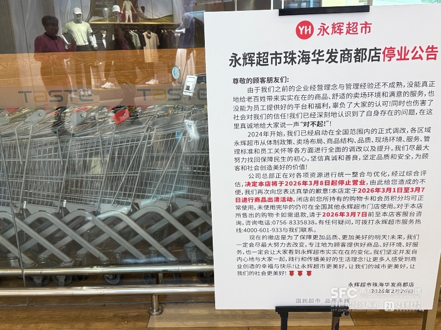 近日,永辉超市珠海华发商都店发布正式停业公告,因公司总部对全国资源进行统一整合优化,经综合评估,永辉超市珠海华发商都店定于2026年3月8日起正式停止营业。从2024年优特汇店闭店,到2025年免税商场店谢幕,再到如今最后一家华发商都店离场,短短几年时间,永辉在珠海的三家门店相继关停。
