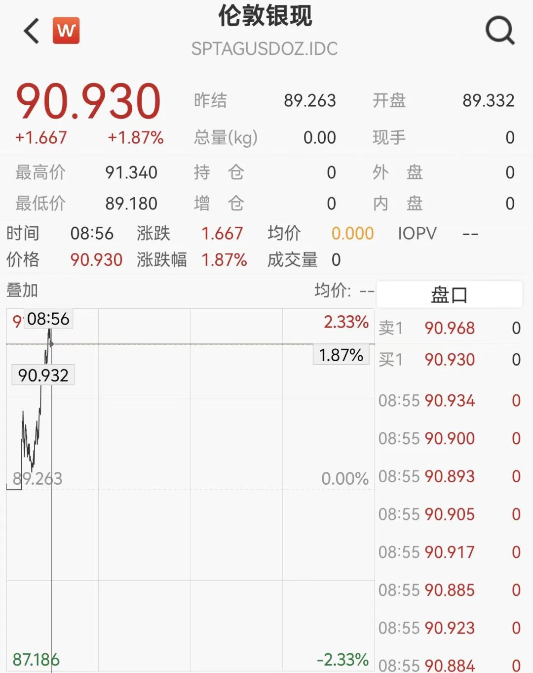 现货金银周二高开反弹,截至发稿,现货黄金涨0.54% 报5350.297美元/盎司, 现货白银反弹,日内涨幅扩大至2%左右,报90.93美元/盎司。