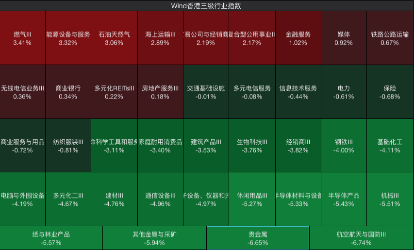 分板块来看,能源相关板块受国际油价飙升及地缘局势推动领涨,Wind香港燃气Ⅲ、能源设备与服务、石油天然气指数分别上涨3.41%、3.32%、3.06%,成交额均超百亿港元,换手率显著高于市场平均水平。跌幅靠前的板块中,航空航天与国防Ⅲ、贵金属、其他金属与采矿指数跌幅居前,分别下跌6.74%、6.65%、5.94%,航天板块中的西锐、中航科工跌超6%;贵金属板块中的中国黄金国际、紫金黄金国际跌超8%。