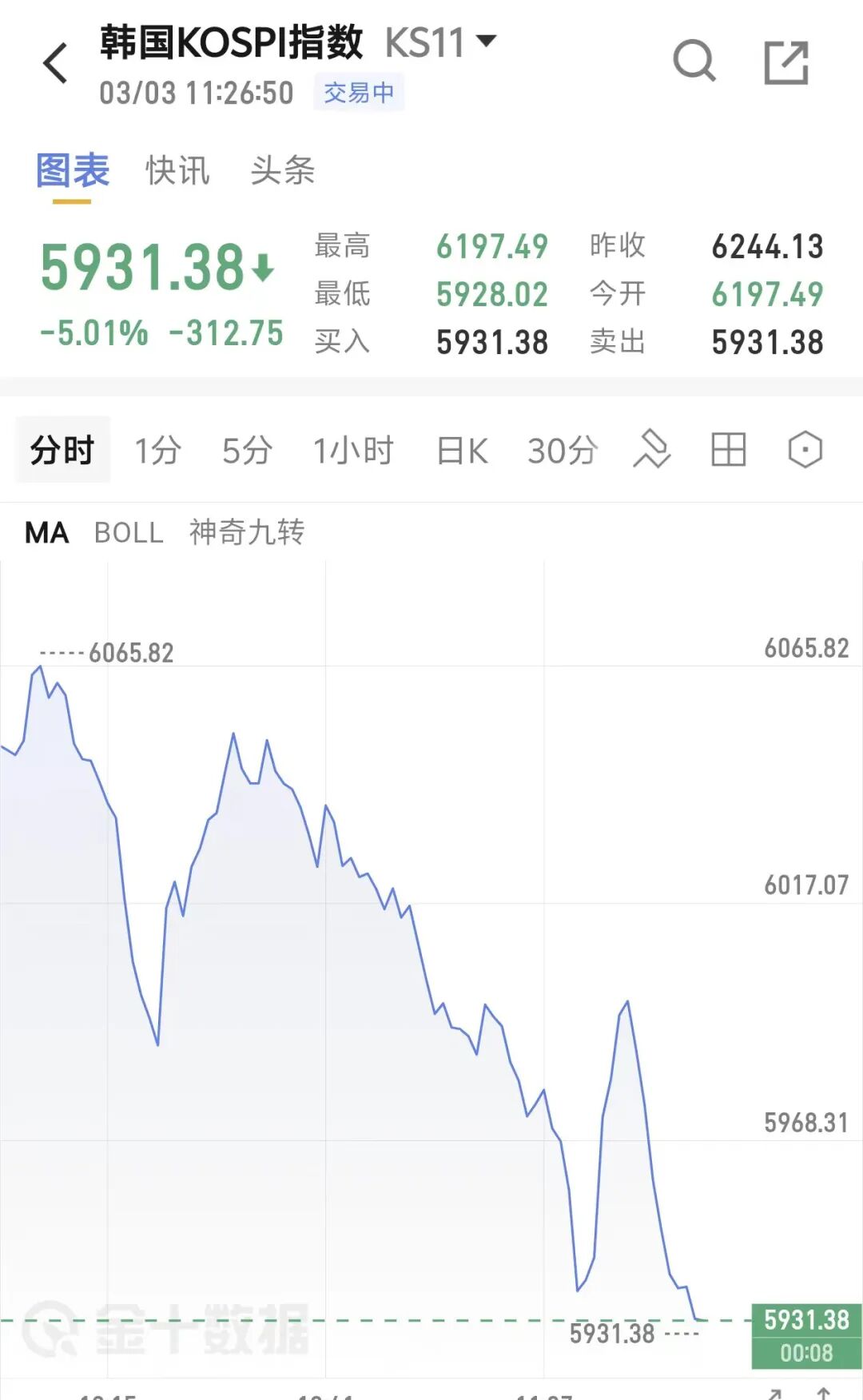 3月3日, 日韩股市持续下跌,截至发稿,日经225指数跌幅扩大,最新下跌2.6%。 韩国股市KOSPI 200指数期货下跌5%,程序化交易暂停5分钟。韩国综合指数跌5%。