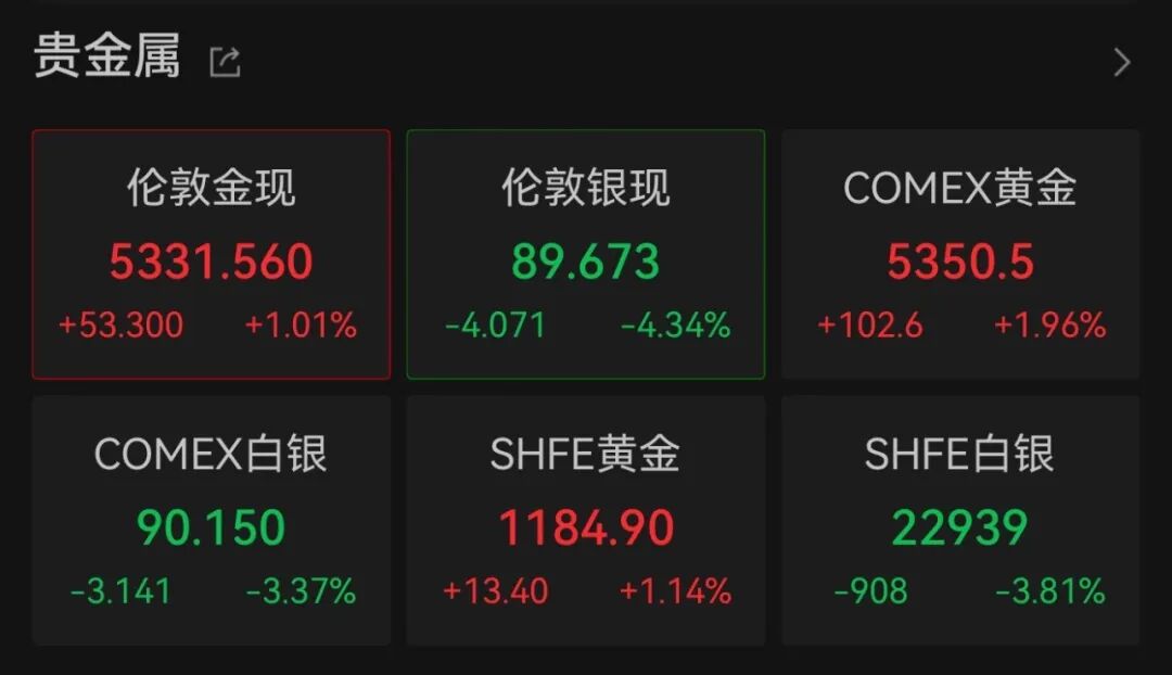 贵金属方面,黄金与白银市场呈现分化走势,黄金延续上行,白银大幅回调。