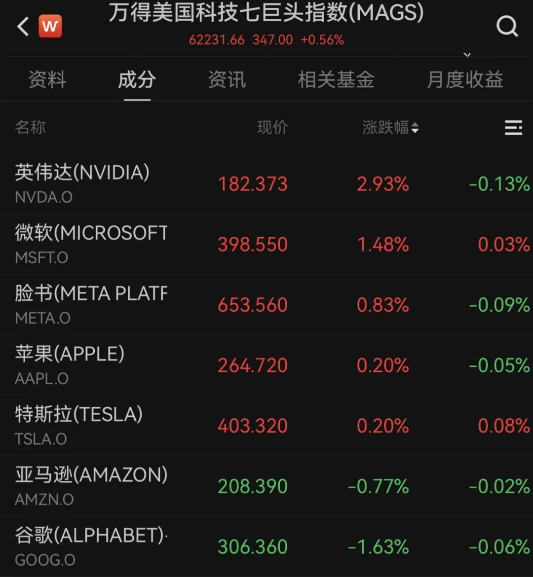万得美国科技七巨头指数上涨0.56%。个股方面,英伟达涨近3%,微软涨超1%, 谷歌母公司Alphabet-C 跌超1%。