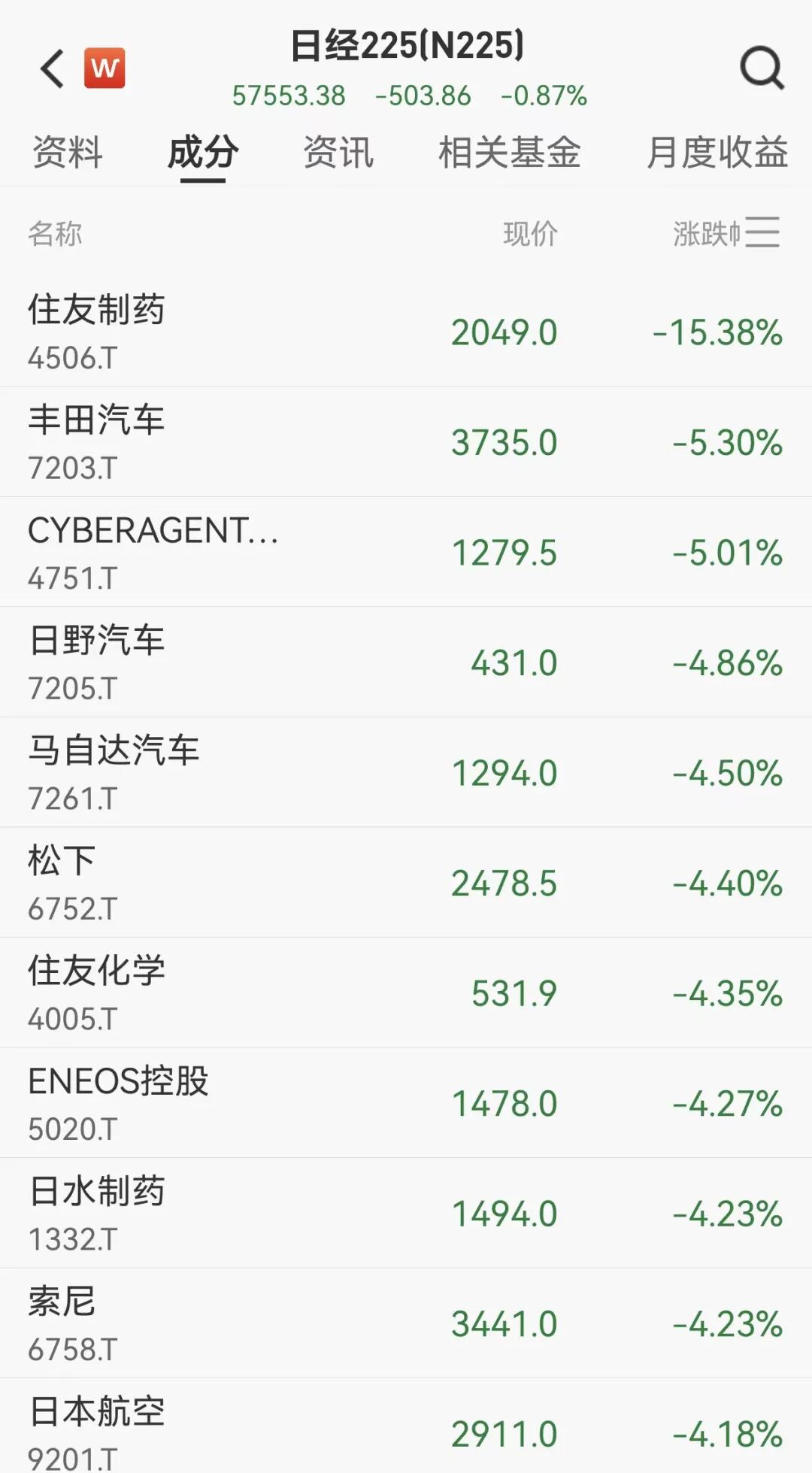 日股制药股、汽车股重挫,截至发稿,住友制药跌超1%,马自达汽车、日野汽车跌超4%,丰田汽车跌超5%,日本航空跌超4%。