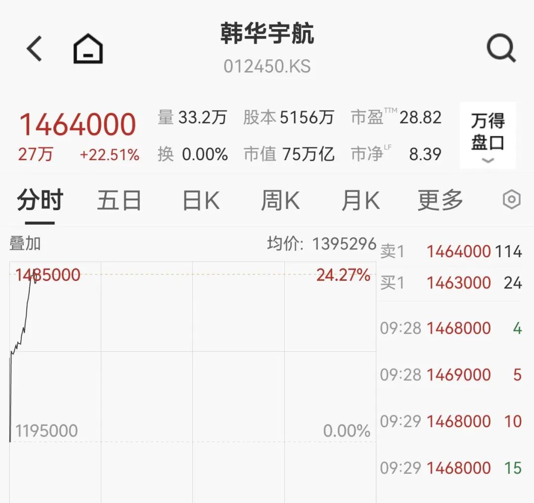 韩国国防股普涨,韩华宇航股价大涨逾22%,LIG NEX1涨约30%达到每日涨幅限制。韩国军工电子企业LIG NEX1的股价飙升至每日30%的涨幅限制。