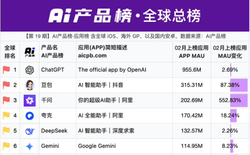 AI产品榜3月3日发布的全球AI应用最新数据显示,MAU(月活用户数)排名前三的AI应用分别为ChatGPT、豆包和千问,其中,千问以2.03亿MAU成为全球第三大AI应用,并以552%的增速居全球第一。从榜单看,国内AI应用已呈现豆包、千问双雄并立的格局。