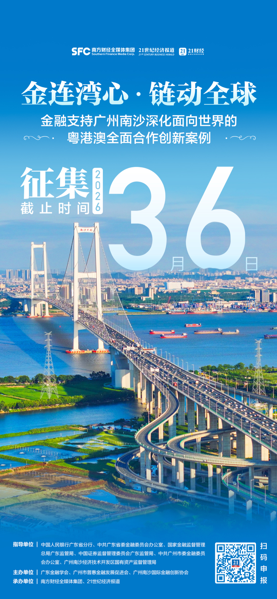 为系统总结、梳理并推广南沙方案发布以来,特别是 “南沙金融 30 条” 实施后的金融创新成果与典型经验,在金融管理部门及地方政府指导下,“金融支持广州南沙深化面向世界的粤港澳全面合作创新案例” 征集活动已正式启动,申报工作将于3月6日截止。