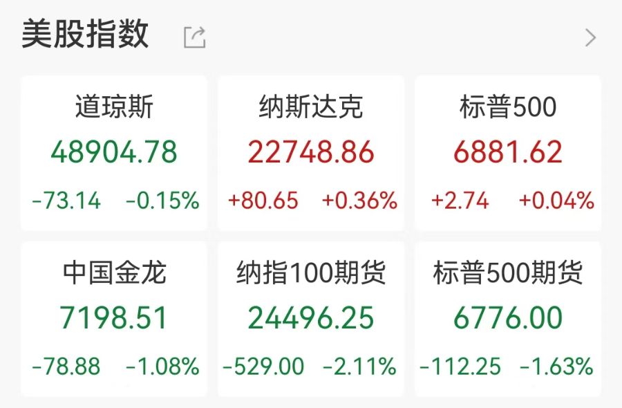 此外,美股主要指数期货全线走低,道指期货、标普500指数期货均跌超1.5%,纳斯达克100指数期货跌超2%。