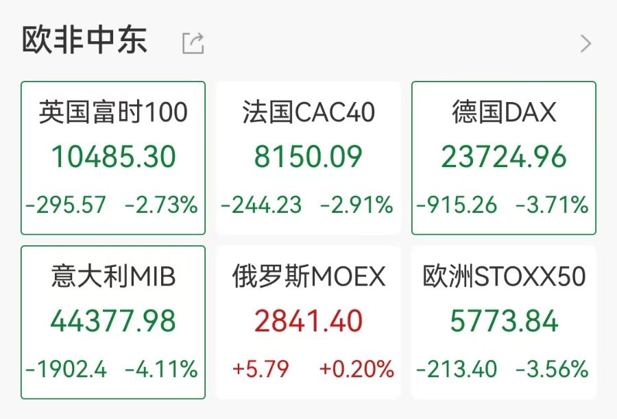 当地时间3月3日,欧洲主要市场开盘大跌。截至20:02,英国富时100指数跌超2.7%,下跌近300点;法国CAC40指数跌超2.9%,下跌超240点;德国DAX指数跌超3.7%,下跌915点;意大利富时MIB指数跌超4%,下跌超1900点,此前一度跌超2000点。