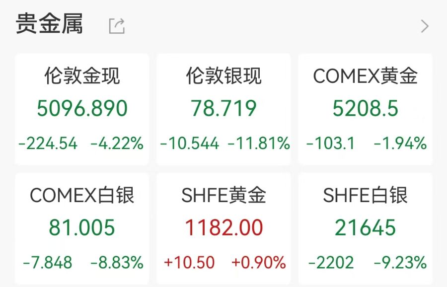截至19:34,现货黄金向下跌破5100美元/盎司,日内下跌超4%。