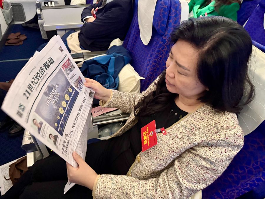 图为全国政协委员林娜阅读《21世纪经济报道》。张雅婷摄