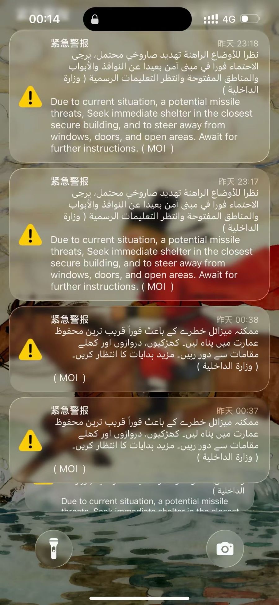 当地时间2月28日晚上,端端和同事一行人刚刚抵达迪拜酒店,四五台手机的铃声便响成一片。“整个房间里,每个人的手机都在响,全是消息提示的声音,大家当时根本不知道发生了什么。这些消息不通过任何App直接推送到手机上,拿起来一看,都是警报,告诉你导弹来了,慌得不行。”