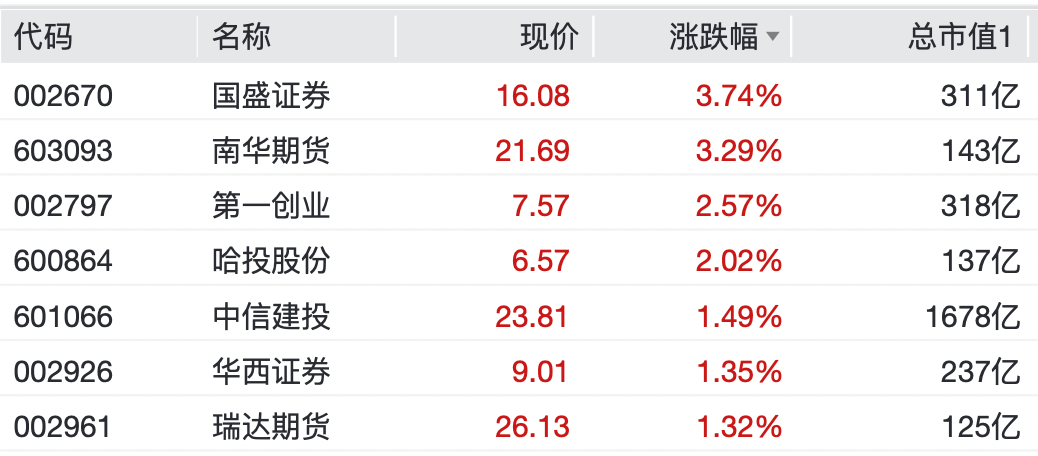 券商股中,国盛证券、南华期货、第一创业、哈投股份、中信建投等个股涨幅居前。