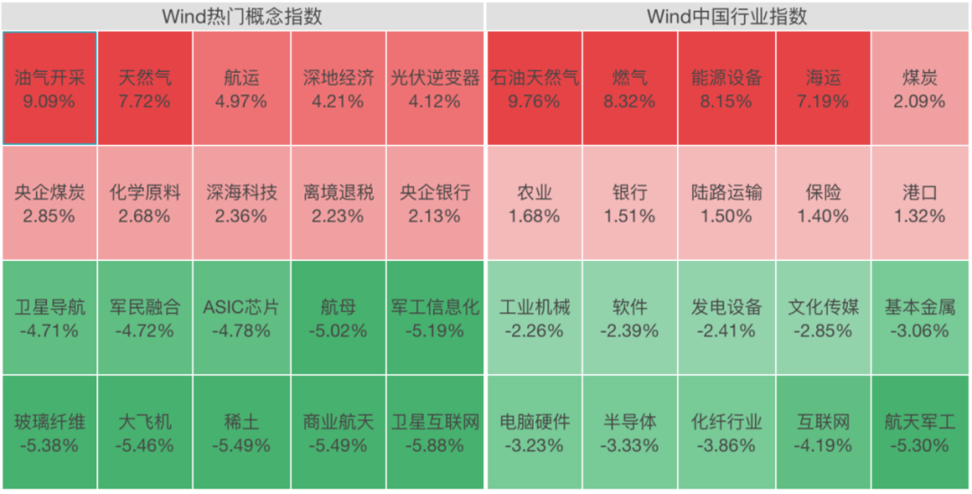 从市场结构看,航天装备、半导体、小金属等板块跌幅居前;而油气板块再次强势拉升,“三桶油”再度集体涨停,燃气、航运港口等板块逆市上涨。