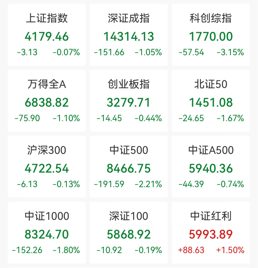 截至午间收盘,沪指报4179.46点,跌0.07%;深证成指跌1.05%,创业板指跌0.44%,科创综指跌3.15%;中证红利指数逆市上涨1.5%。