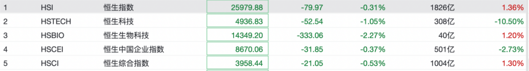 港股市场延续下跌。截至发稿,恒生指数跌0.31%,恒生科技跌1.05%。