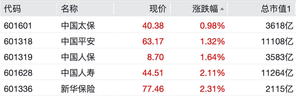 保险股同样全线飘红。新华保险领涨2.31%,中国人寿涨2.11%,中国人保、中国平安涨1%。