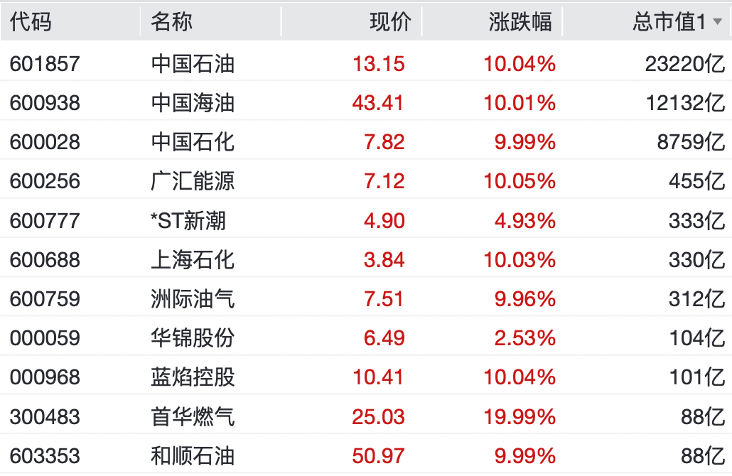多只油气股再次涨停。中国石油、中国海油、中国石化再次集体涨停。首华燃气录得20cm涨停,广汇能源、上海石化、洲际油气、蓝焰控股、和顺石油、泰山石油等均录得涨停。