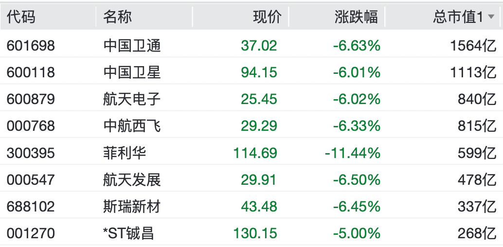 早盘航天军工板块单边下行,卫星互联网、商业航天等概念方向领跌。