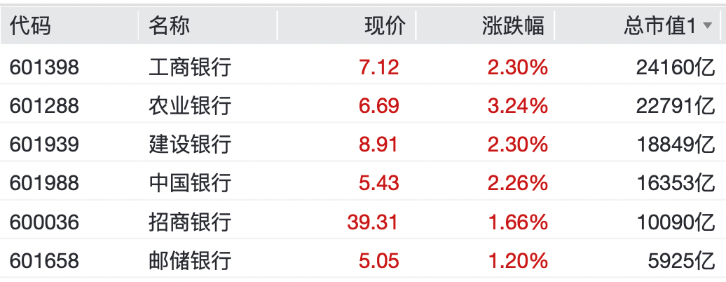 银行股全线飘红。其中,重庆银行涨超7%,渝农商行涨超4%。农业银行涨超3%,工商银行、建设银行、中国银行、中信银行、交通银行均涨超2%。