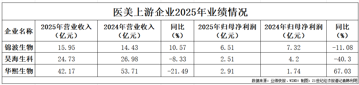 值得关注的是,这是锦波生物自2023年7月登陆资本市场以来,首次出现归母净利润同比下滑的情况。而其业绩增速放缓,也折射出医美上游行业的承压态势。此前已遭遇发展瓶颈的玻尿酸企业,2025年业绩表现同样分化。