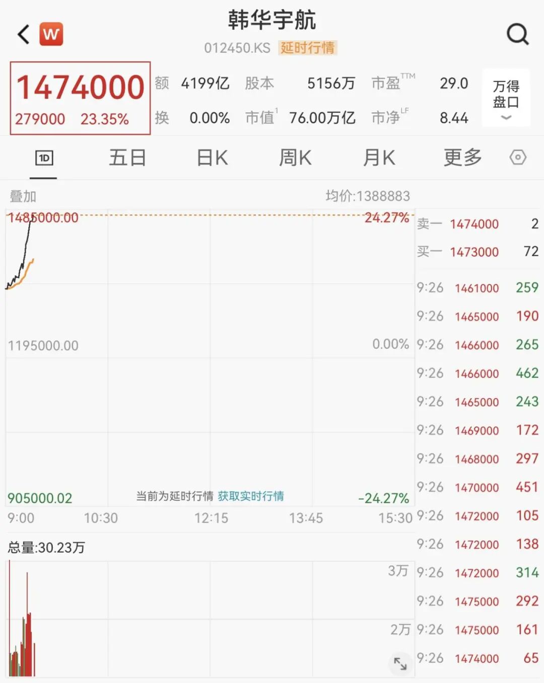 韩国国防股普涨,韩国航空航天制造商与武器制造商LIG NEX1涨约30%,达到每日涨幅限制,韩华宇航股价大涨逾23%。