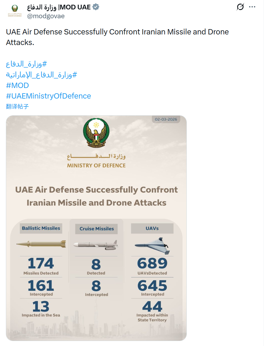 据阿联酋官方通讯社WAM报道,阿联酋国防部称,周一有9枚弹道导弹、6枚巡航导弹 和148架无人机袭击了该国。自伊朗开始发动袭击以来,已有174枚弹道导弹和数百架无人机以该国为目标。